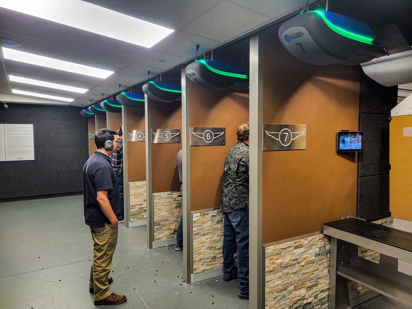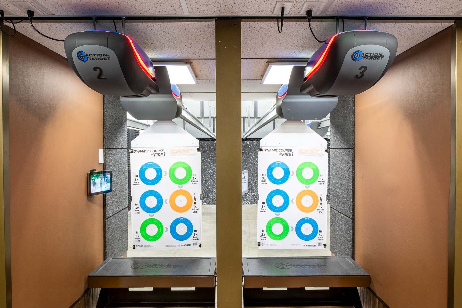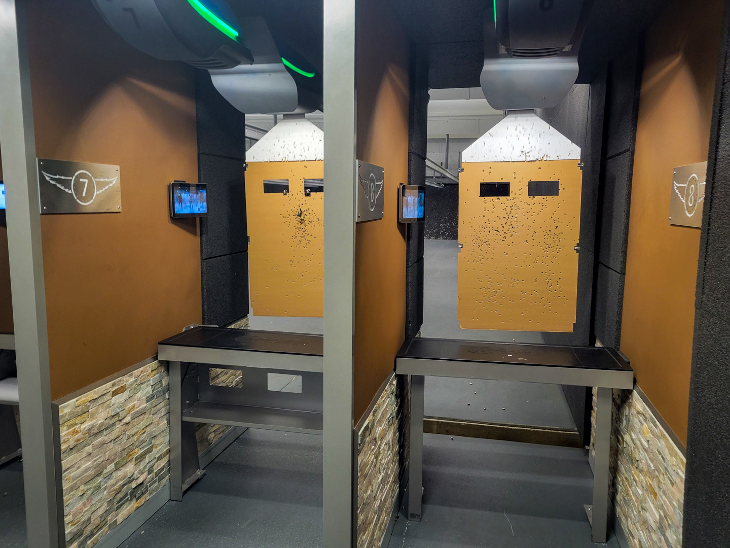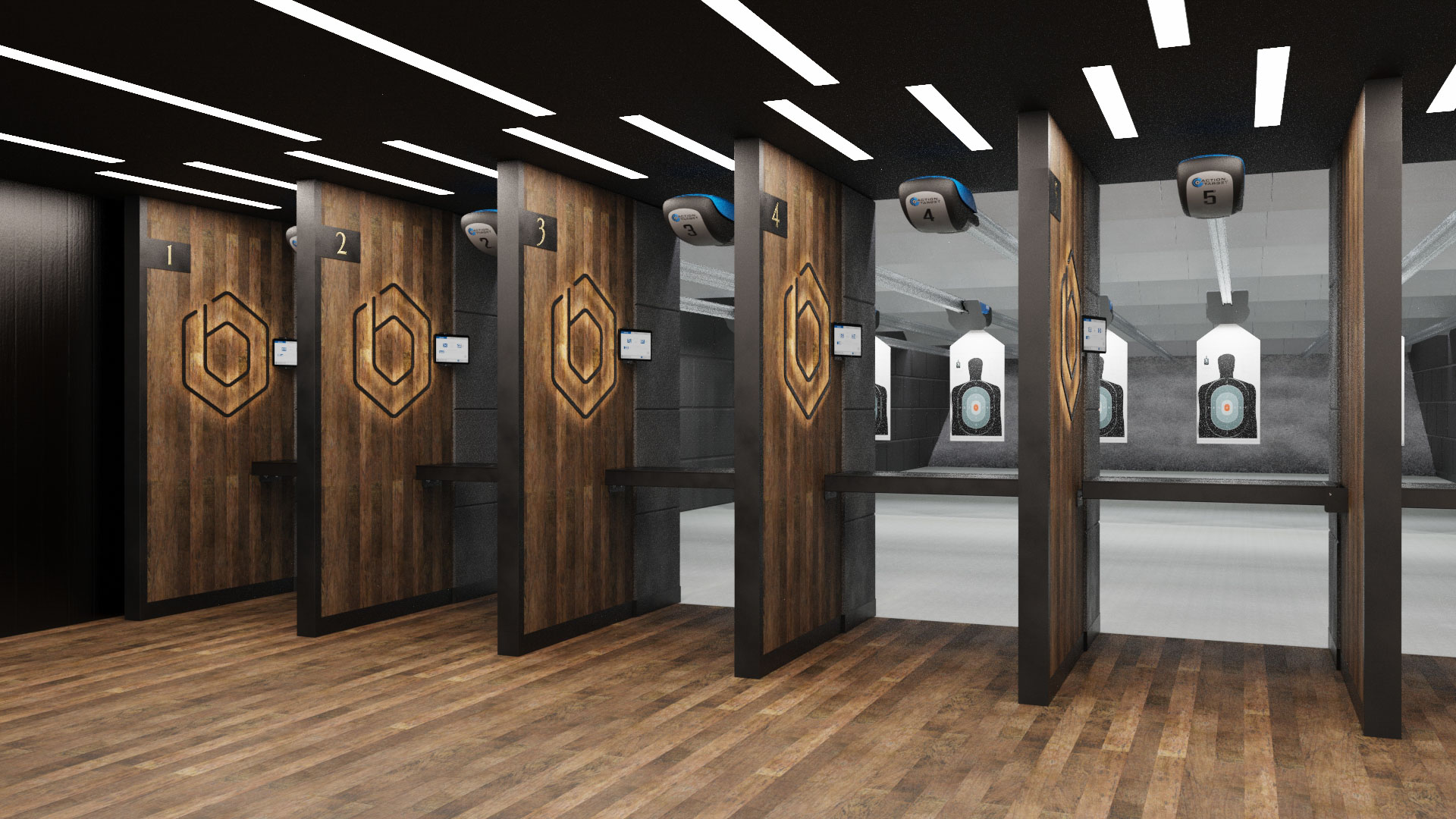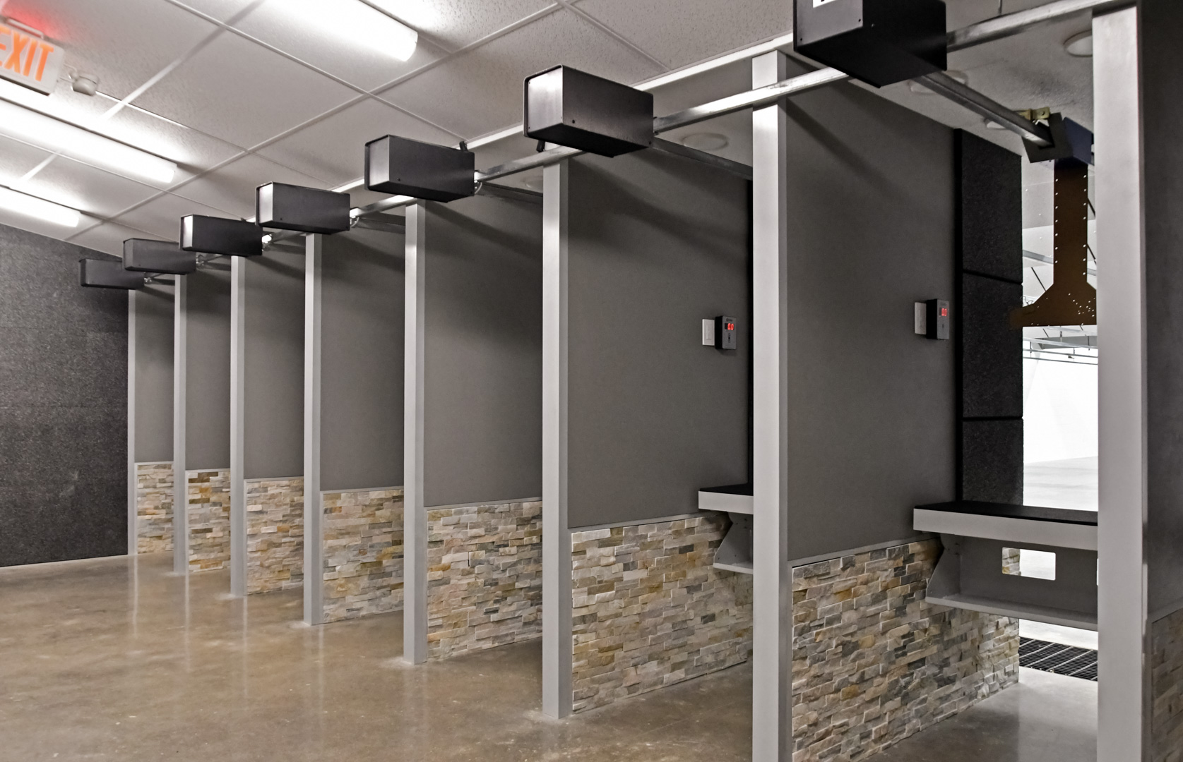 Overhead stall lighting improves visibility without creating downrange glare.