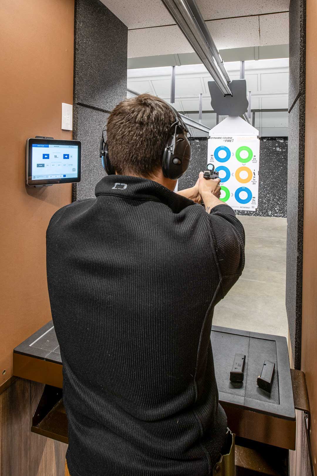 Integrated muzzle blast barrier helps shield adjacent lanes to reduce disruption and preserve focus.