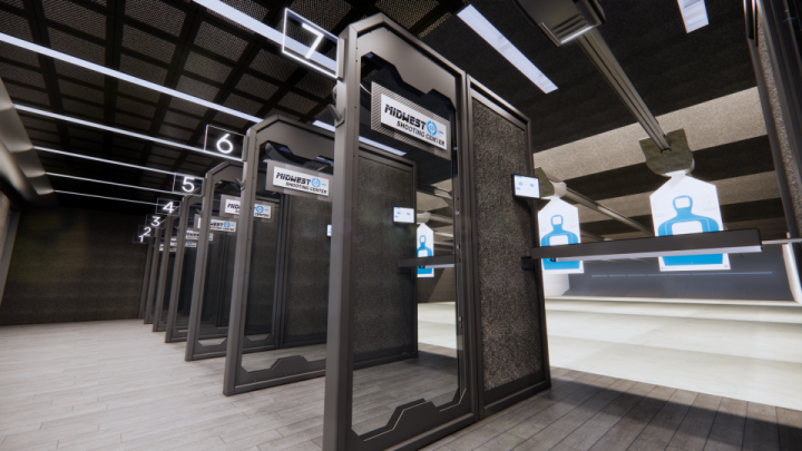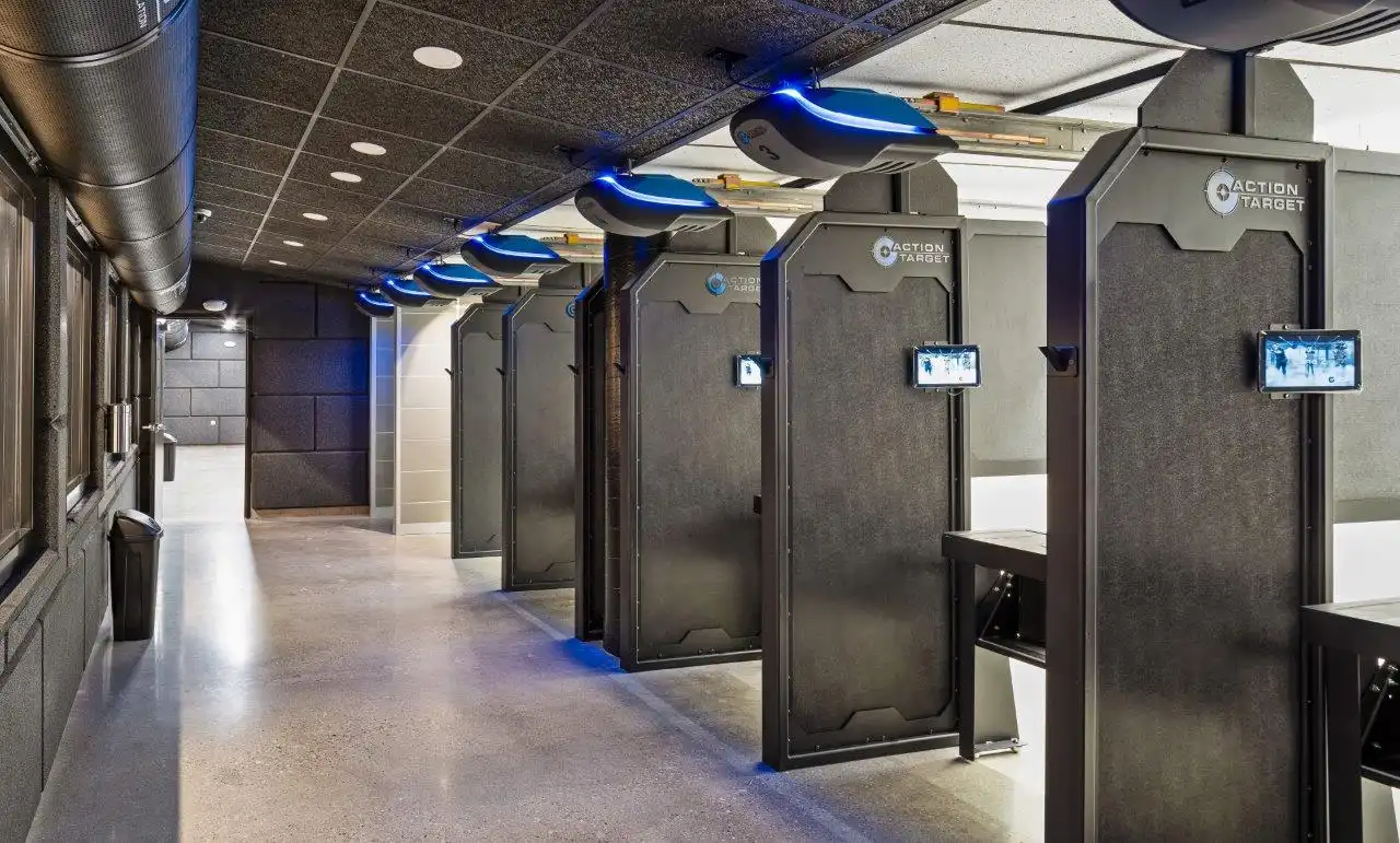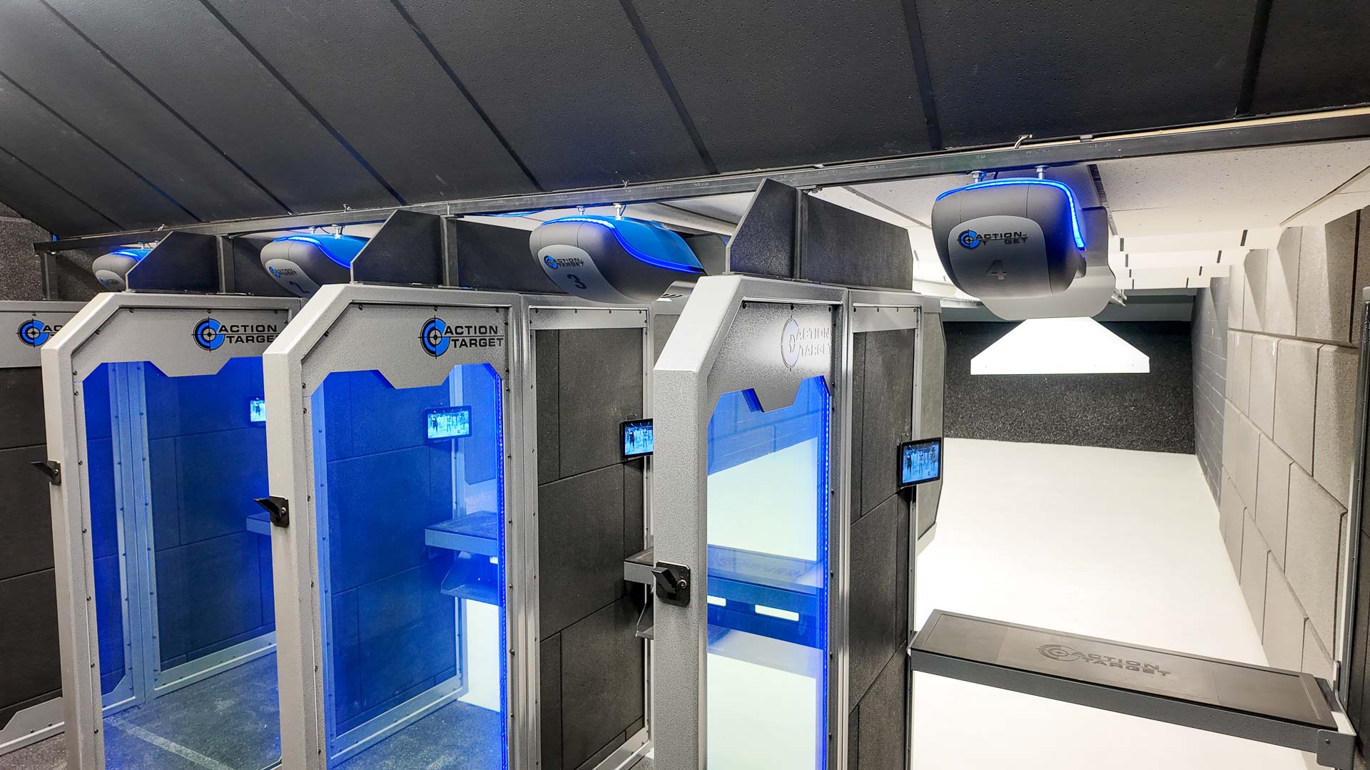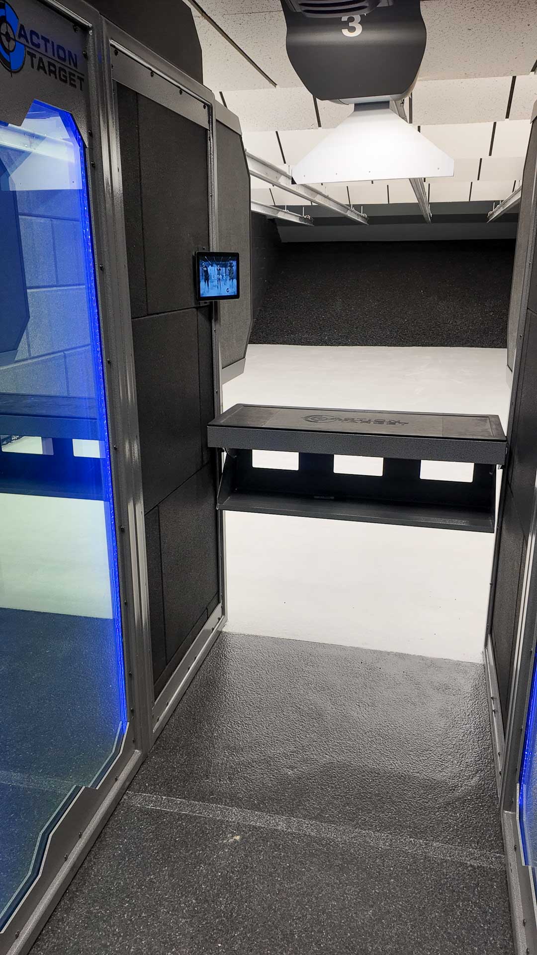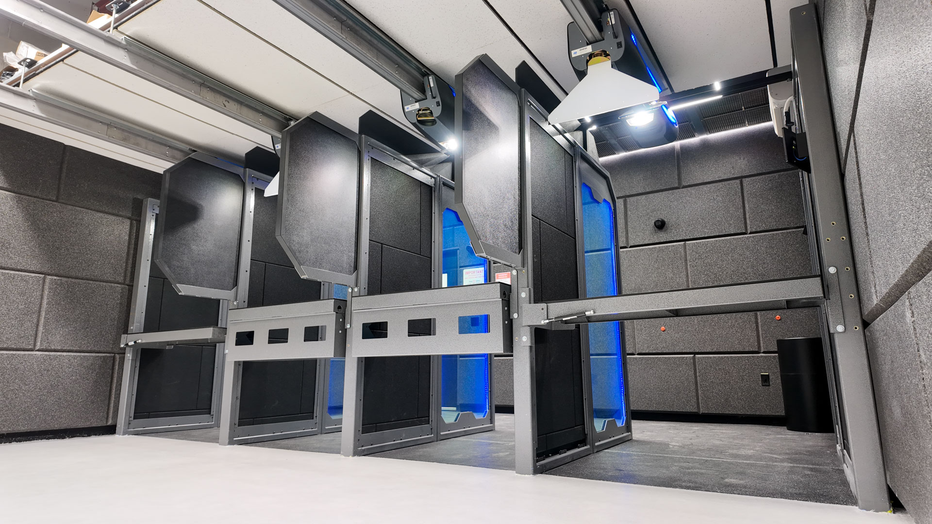 Integrated stall tables and shelves accommodate tactical, rifle, or pistol lanes.