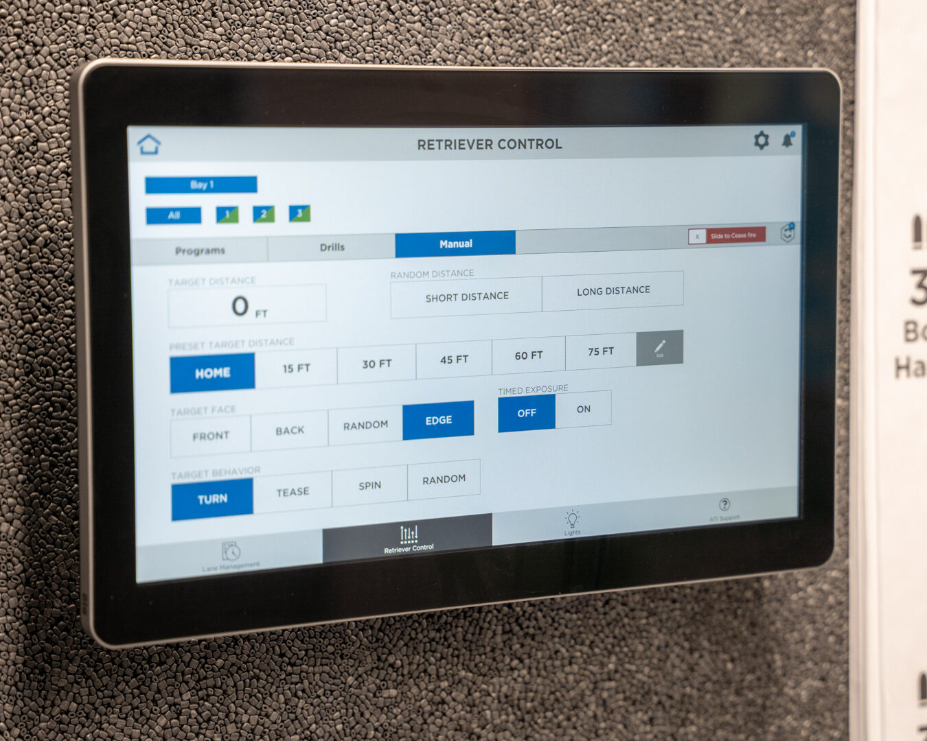 At the heart of this build is a tightly integrated control layer that makes the range feel effortless. SmartRange AXIS™ unites Genesis and Pilot retrievers, lane lighting, user permissions, drills, and HVAC/ventilation into a single interface tuned for this 35-yard, three-stall layout.