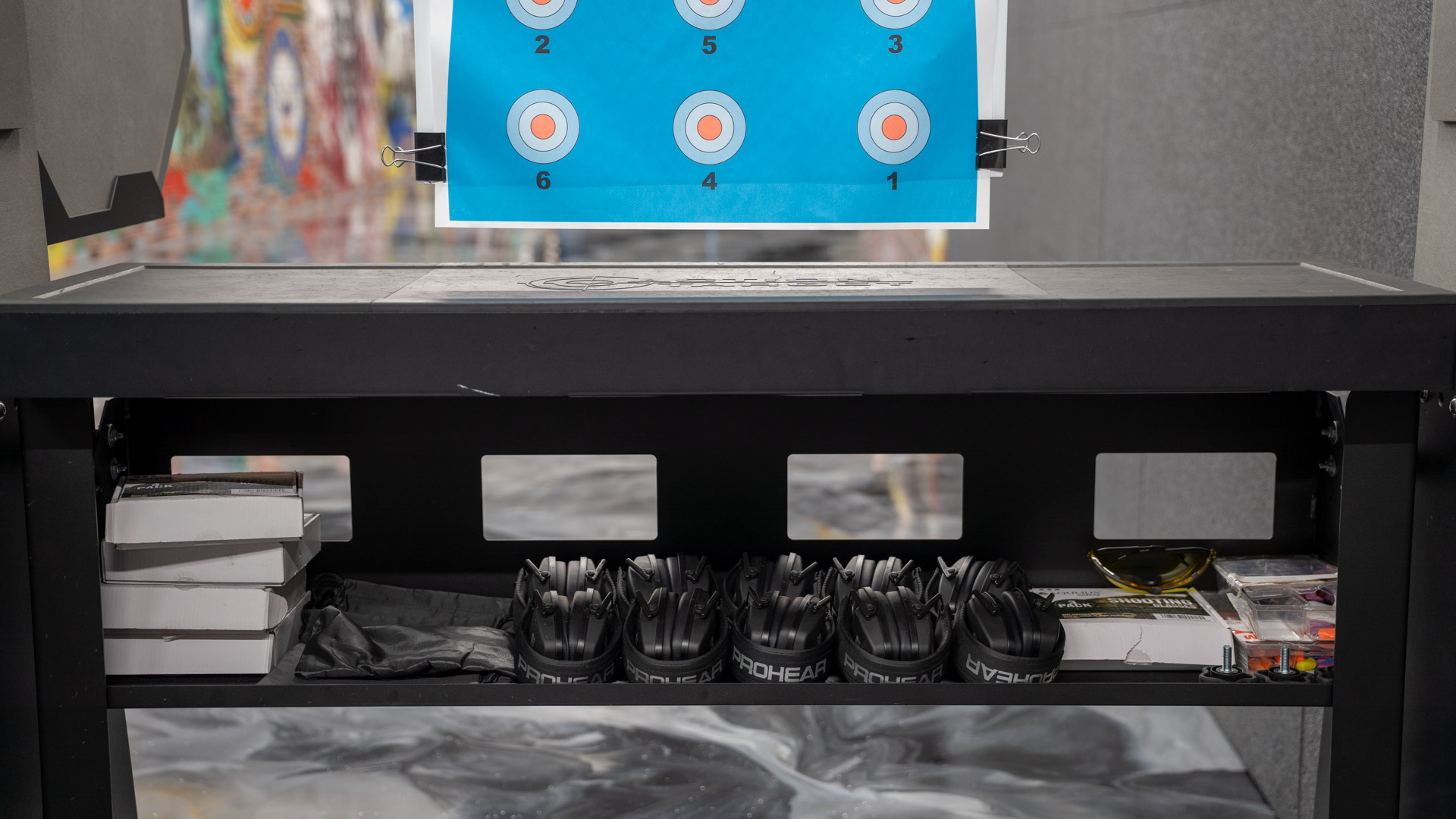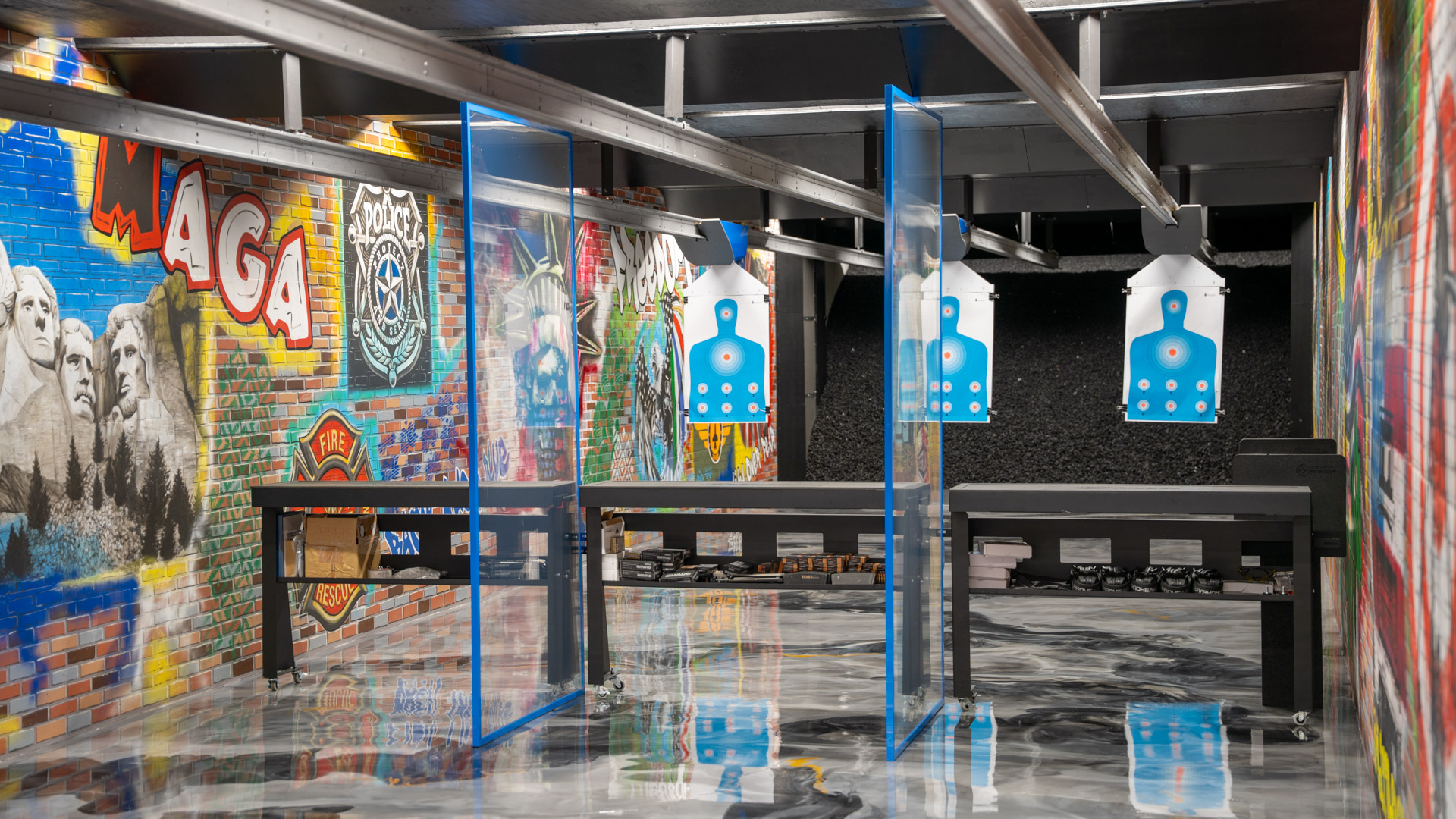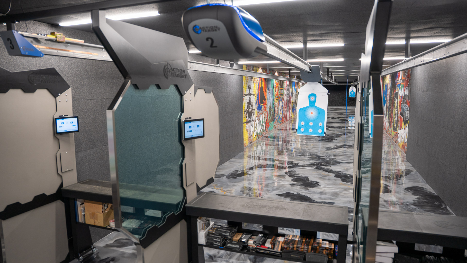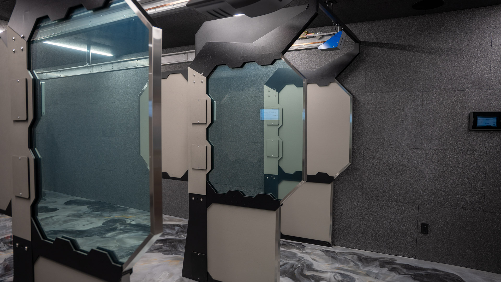 This custom 2,000-square-foot, 35-yard, three-stall indoor home shooting range, built inside the garage of an avid car, truck, and motorcycle collector, pairs elite craftsmanship with serious performance. A dedicated arsenal vault houses a remarkable collection of rare firearms, and hand-painted wall art transforms the lanes into a one-of-a-kind gallery. Integrated with Action Target’s SmartRange AXISTM, the entire range operates from a unified control hub. This installation features GenesisTM and PilotTM target retrievers, a Rubber Berm TrapTM, ceiling safety baffles, Defender Stalls™, and comprehensive sound abatement.